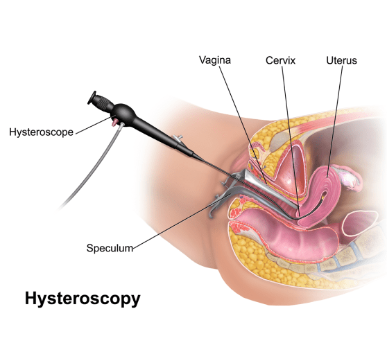 - A hysteroscope, a thin lighted tube, is inserted through the vagina and cervix into the uterus.